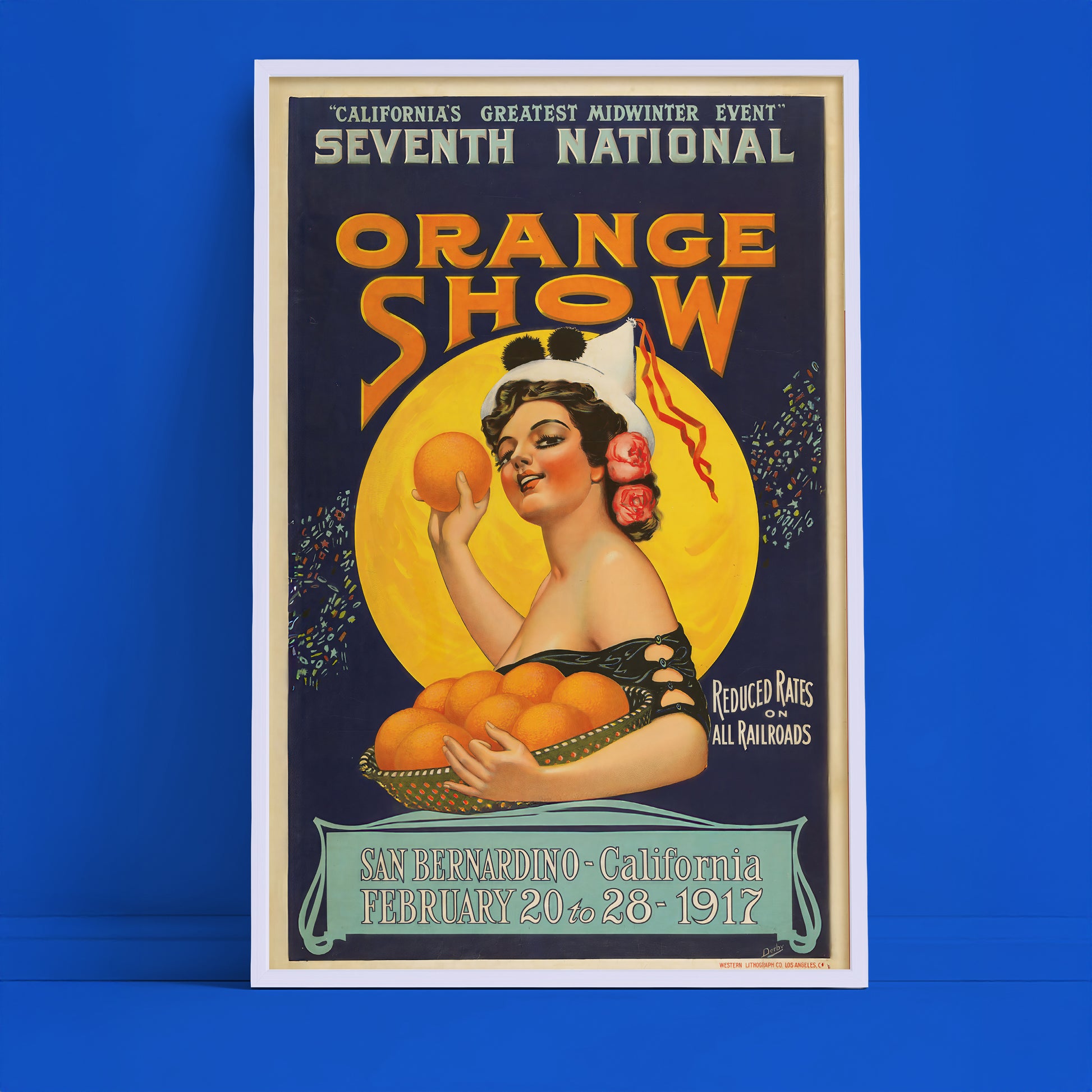 Celebrate the golden age of California citrus culture with this beautifully restored 1917 Seventh National Orange Show poster. Featuring a glamorous, classic early-20th-century illustration, the artwork showcases a stylish woman holding a basket of bright oranges against a bold moonlit background. Originally promoting “California’s Greatest Midwinter Event” in San Bernardino, this piece captures the charm, color, and optimism of the era.
