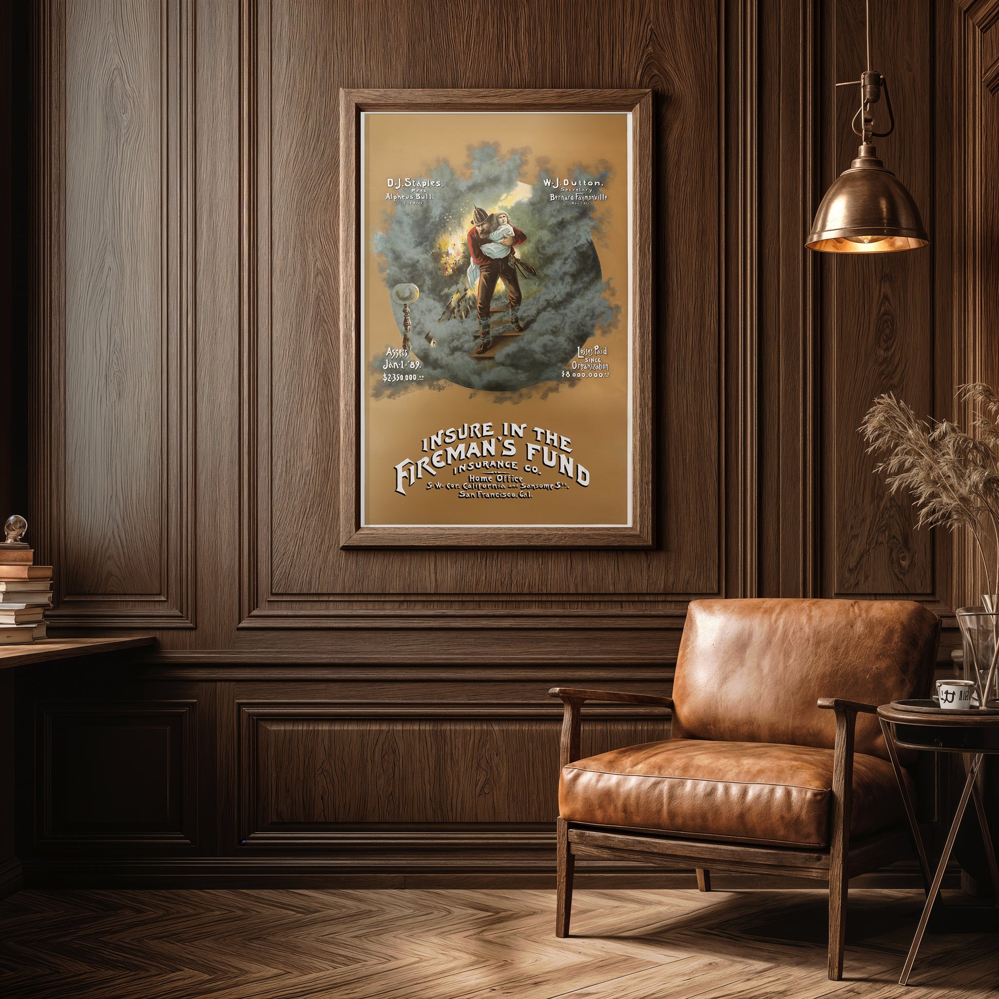 This dramatic vintage Fireman’s Fund Insurance Co. poster captures a heroic 19th-century firefighter carrying a child to safety as flames and smoke rise behind them. With bold typography, rich color, and hand-painted detail, this 1889 advertisement blends early American commercial art with timeless themes of bravery and protection.