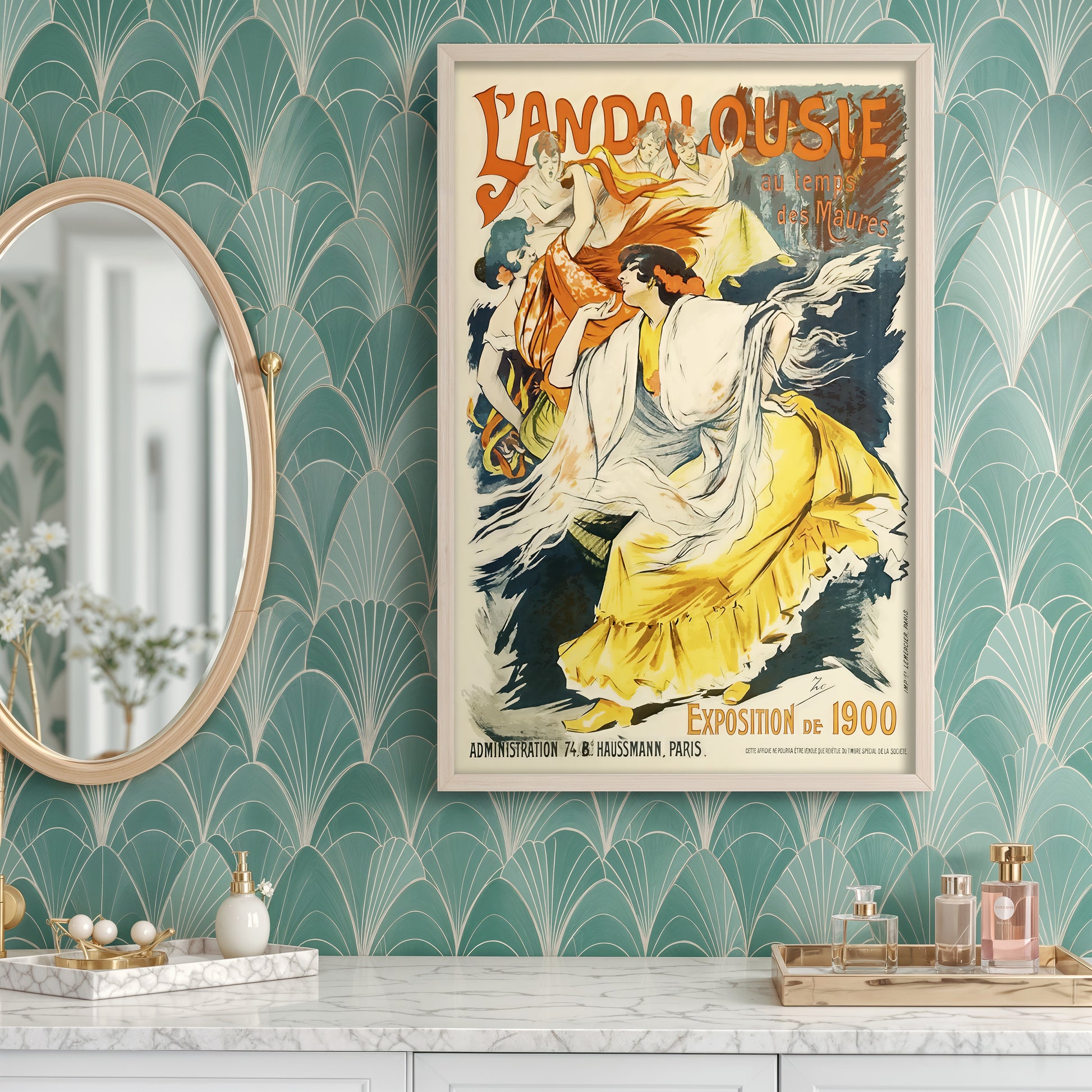 Celebrate Belle Époque elegance with this reproduction of the classic L’Andalousie au Temps des Maures poster — originally created for the 1900 exhibition in Paris. The design evokes Moorish-era Andalusia, with vibrant colors, flowing costumes, and Art Nouveau charm.