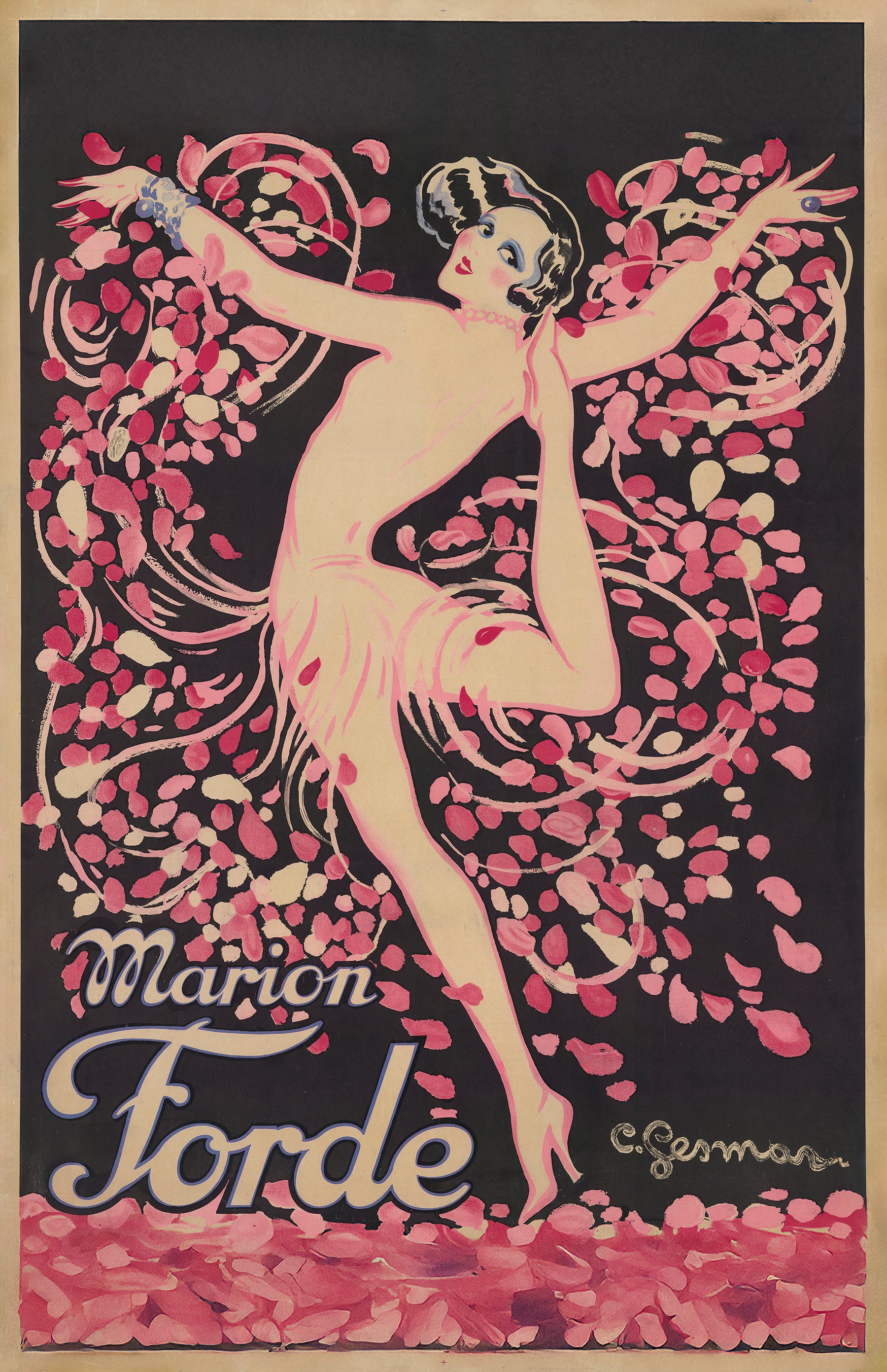 Celebrate the glamour and movement of the Art Deco era with this dazzling Marion Forde vintage poster reproduction. Bursting with swirling pink petals, bold black contrast, and an elegantly posed dancer, this 11×17 print is a showpiece of early 20th-century performance advertising.