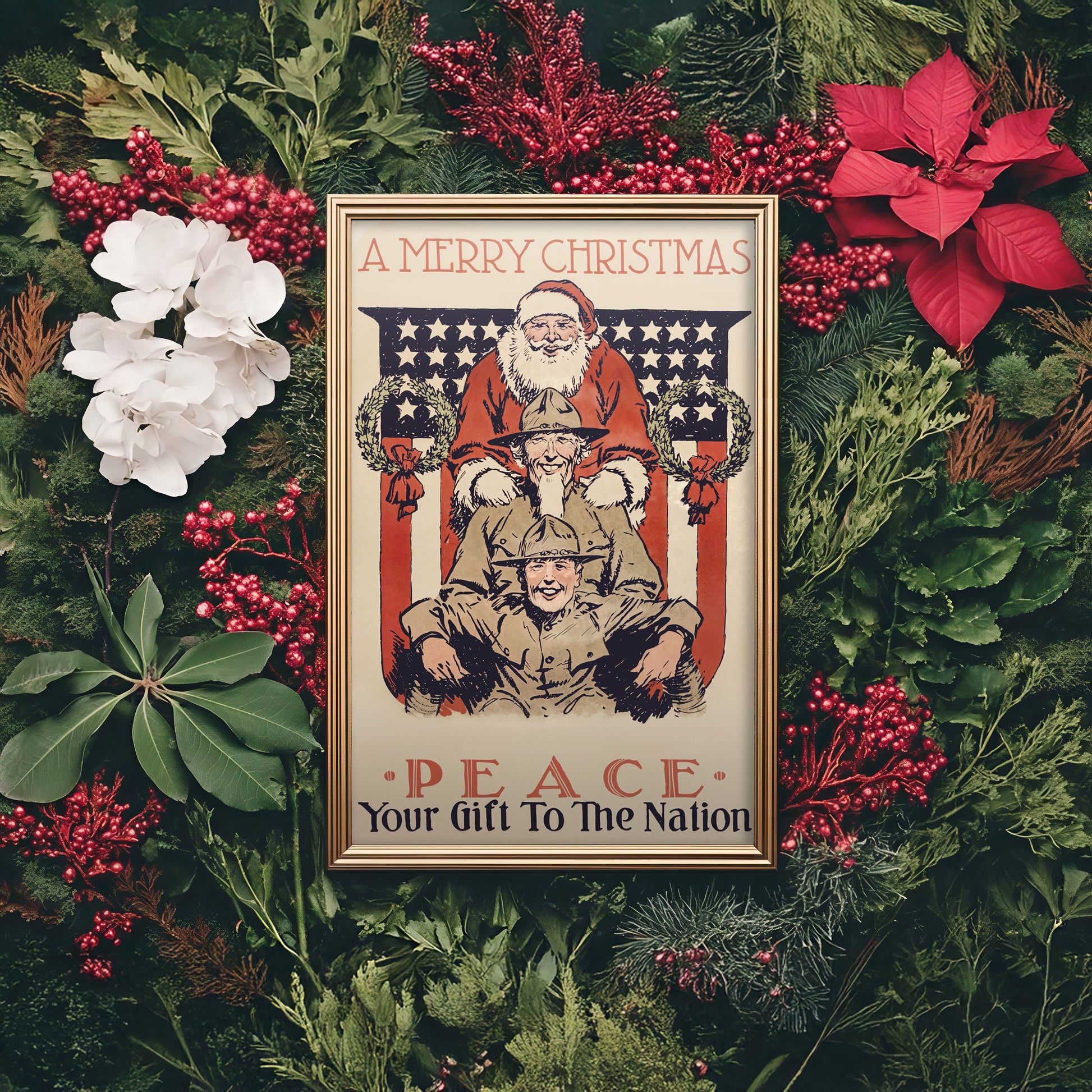 This restored vintage Christmas poster blends holiday warmth with patriotic spirit, featuring Santa Claus standing proudly behind two uniformed soldiers framed by festive wreaths and an American flag backdrop. Originally created as a morale-boosting illustration, it captures the message “Peace — Your Gift to the Nation,” reminding viewers of unity, gratitude, and hope during the holiday season. Perfect for collectors of historical posters, vintage Christmas art, or Americana décor, this print brings classic charm and meaningful sentiment to any wall.