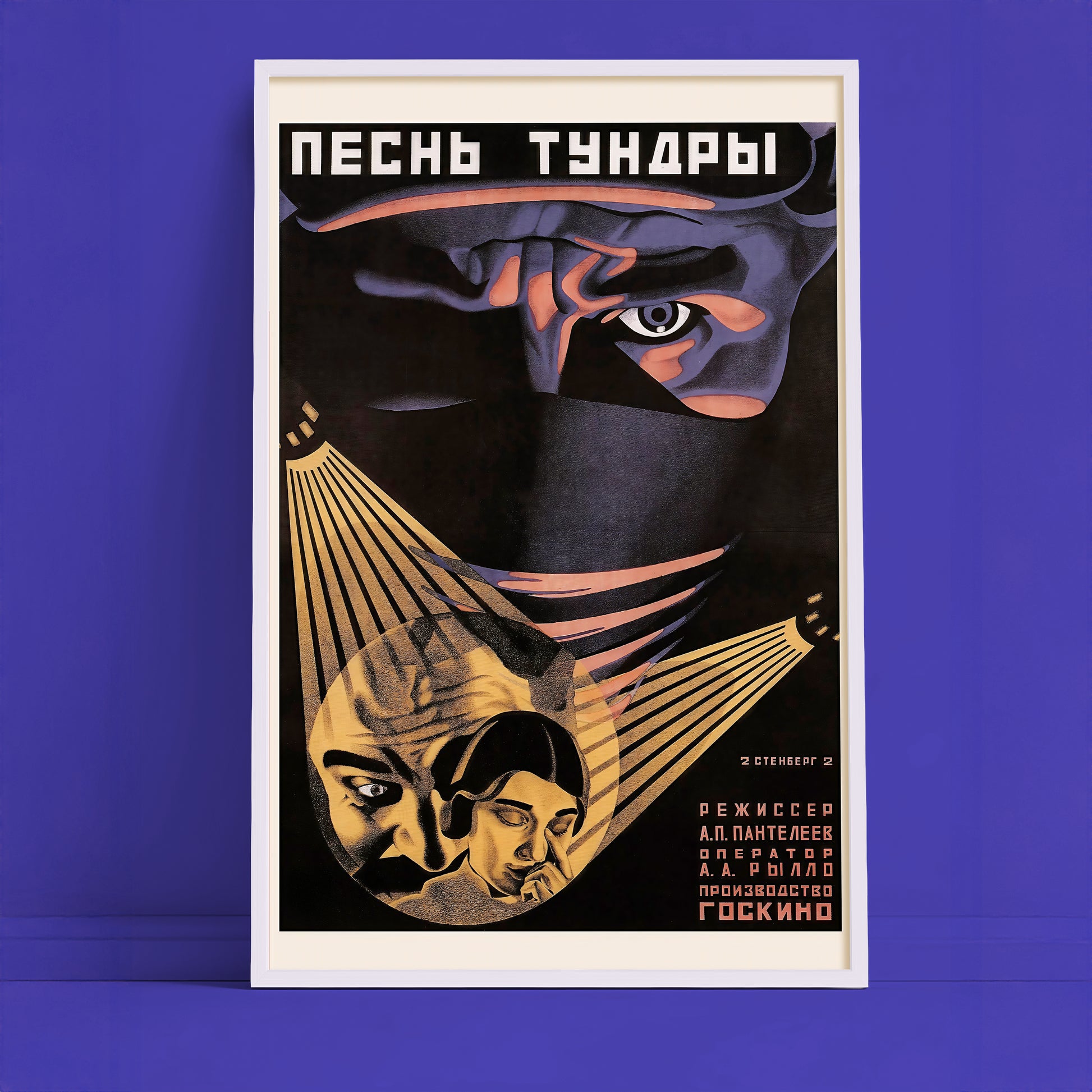Striking, moody, and powerfully modern, this vintage Russian film poster for Song of the Tundra exemplifies the bold visual language of Soviet avant-garde and Constructivist design. Featuring dramatic lighting, abstract geometry, and layered human forms, the composition reflects the experimental spirit of early Soviet cinema and machine-age graphic art.