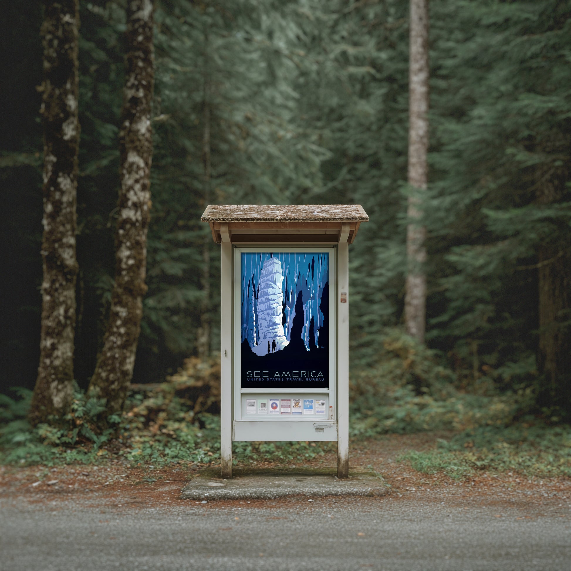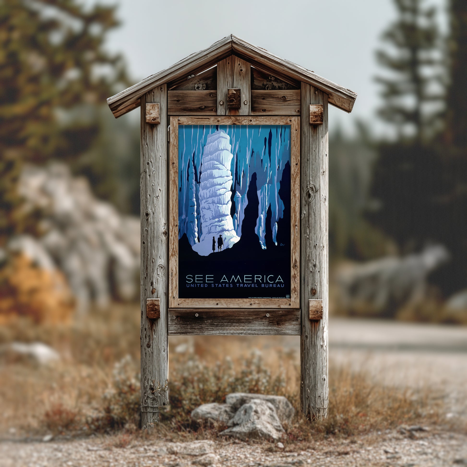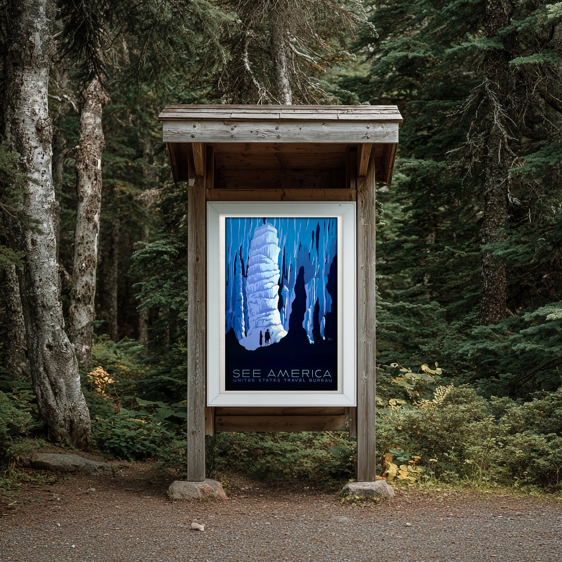 Featuring dramatic shades of blue, towering cavern formations, and two explorers silhouetted against icy limestone, this artwork beautifully captures the awe and mystery of America’s underground landscapes. Perfect for lovers of vintage travel art, national park collectors, and anyone who appreciates classic WPA-style illustration.