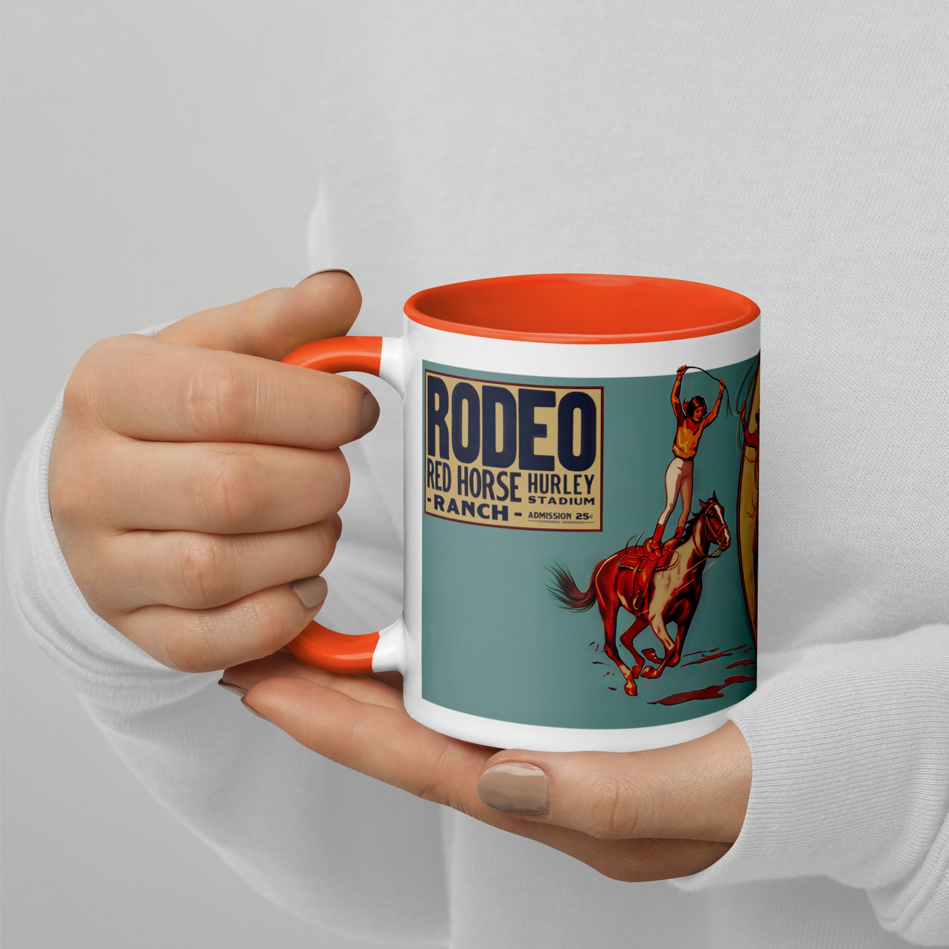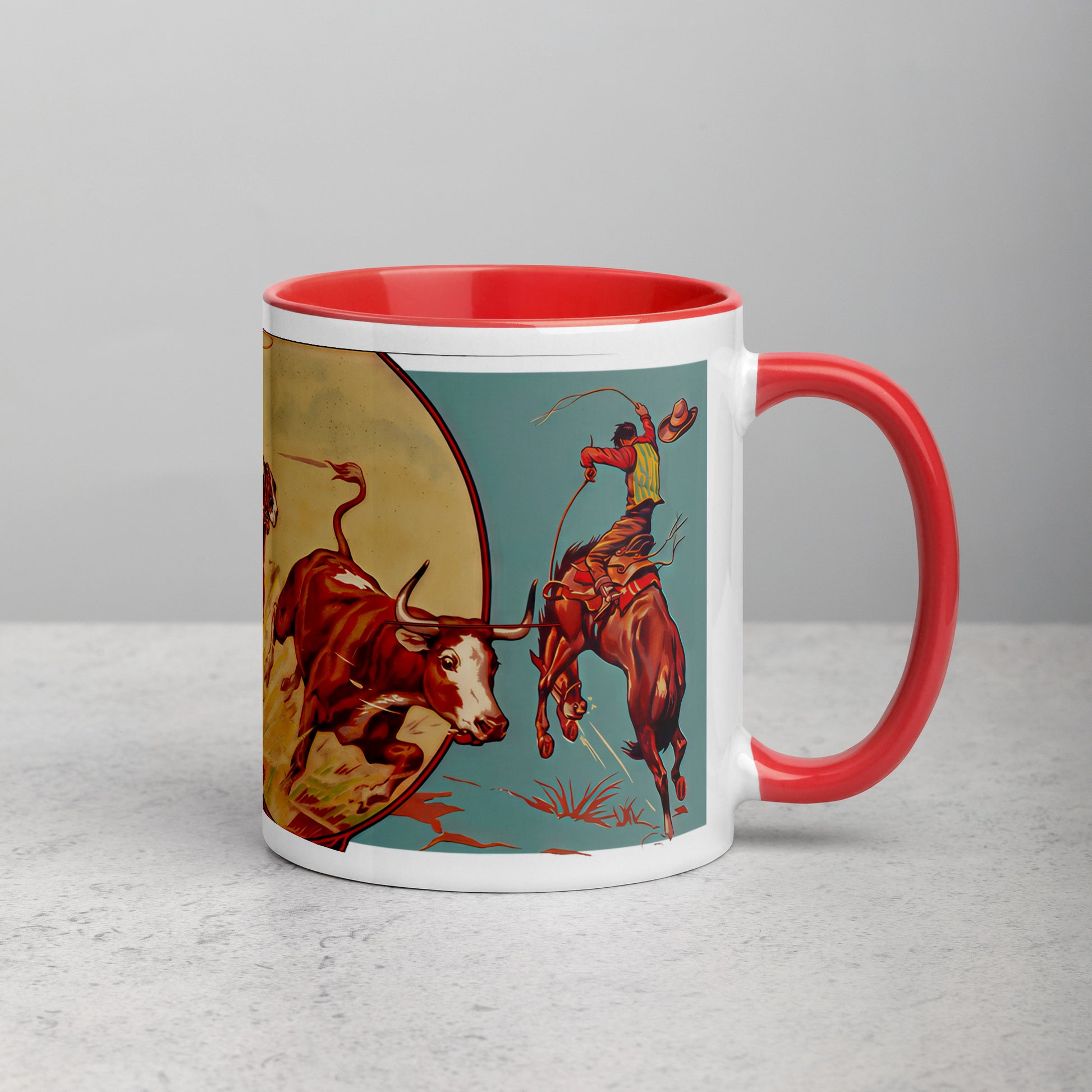 Celebrate classic Western Americana with this 11 oz porcelain mug featuring bold vintage rodeo artwork from the Red Horse Hurley Ranch. The dynamic mid-century illustration captures the thrill of cowboy culture—broncs, bulls, and big ranch energy—making it a standout piece for everyday coffee or display.
