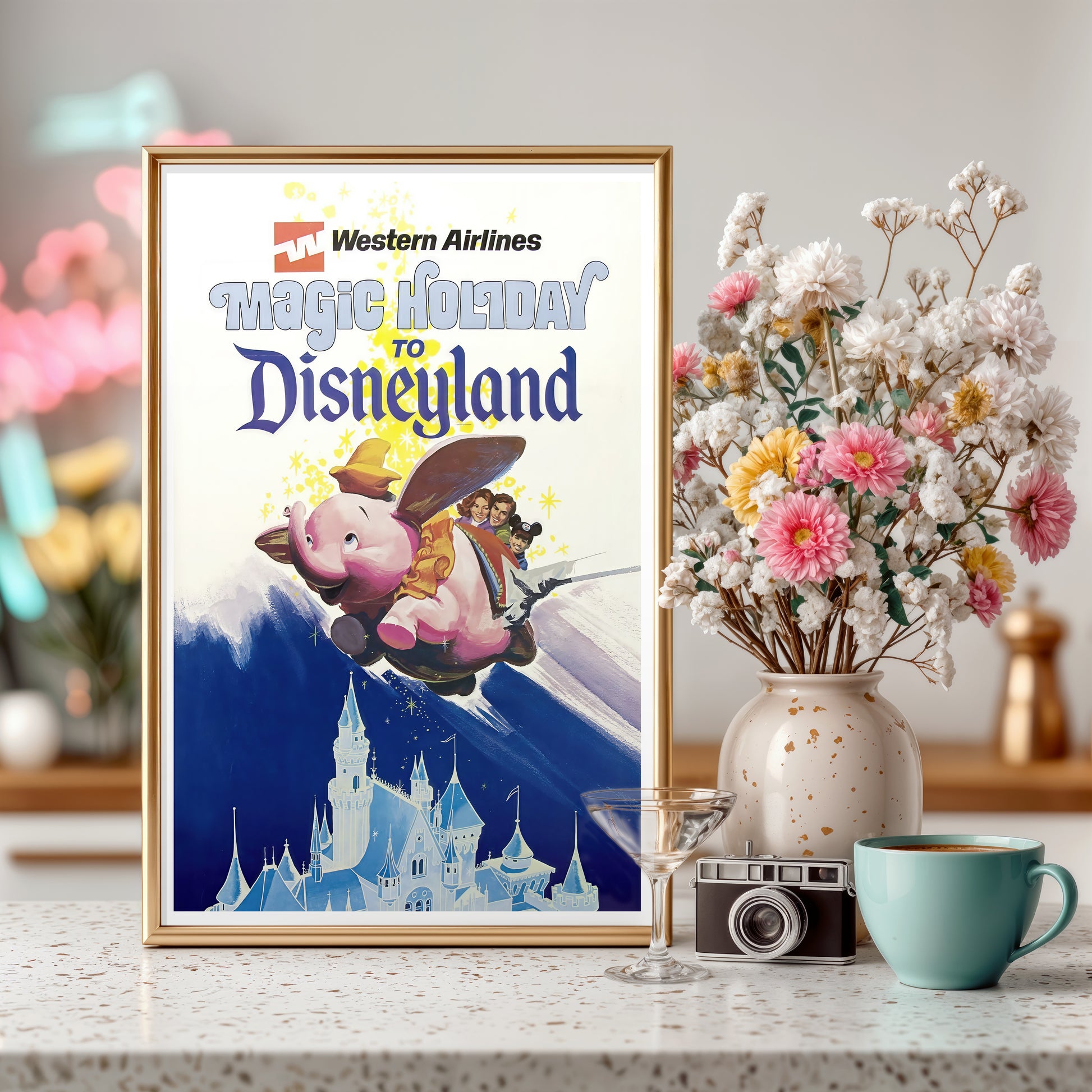 Step back into the golden age of travel and Disney magic with this restored Western Airlines “Magic Holiday to Disneyland” vintage poster. Featuring Dumbo soaring over Sleeping Beauty’s Castle with a joyful family aboard, this artwork captures the wonder of mid-century air travel and Disneyland’s early days.